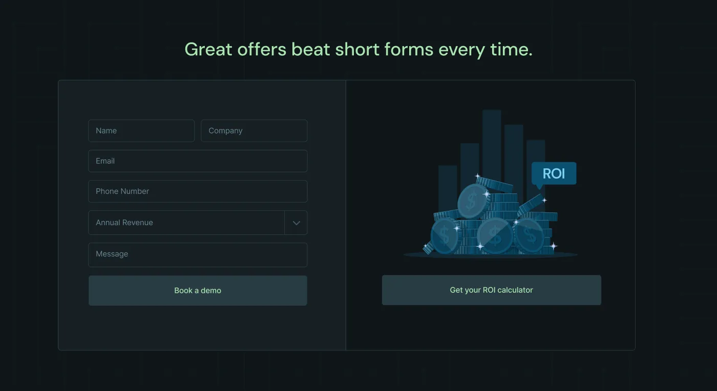 - Test offers, not just forms. Example A/B: ROI Calculator (5 fields) vs. Generic Demo Request (3 fields).